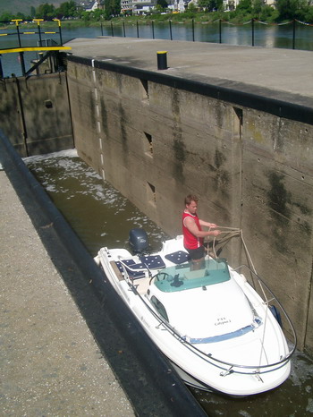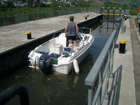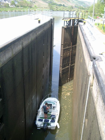 Schleuse Detzem. Dort machen wir vor dem Schleusentor fest und lesen uns