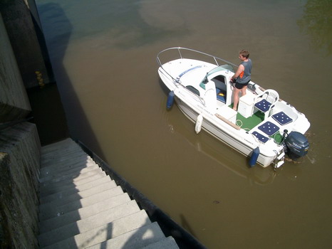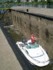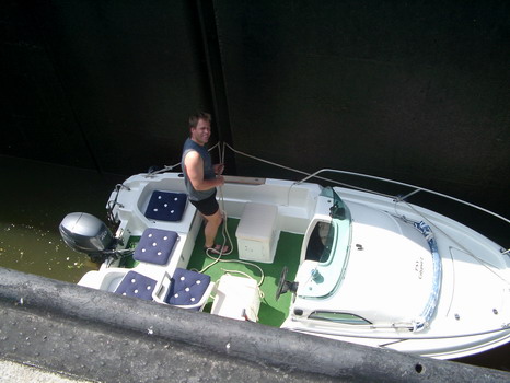 zu sein. Also, Boot in die Schleuse, Leinen belegen, Hebel auf Talfahrt,