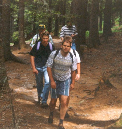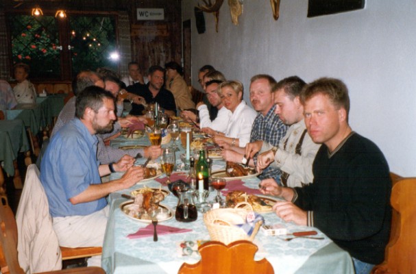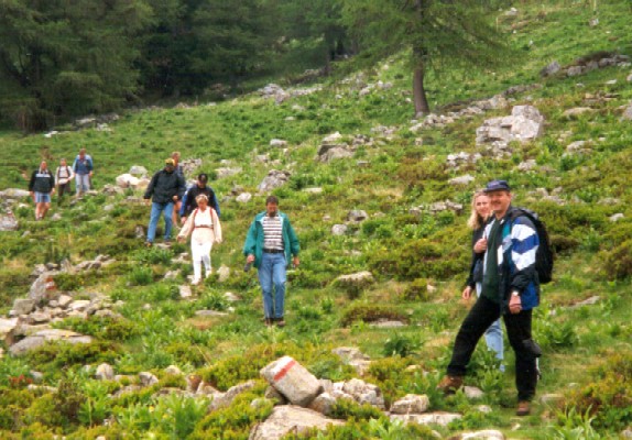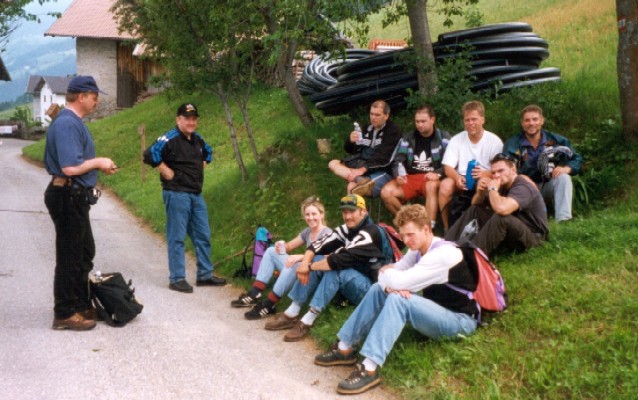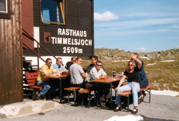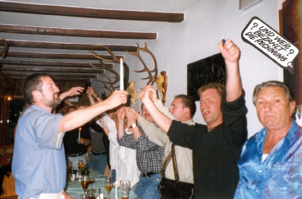 Mittwoch, 09.06.99. Wir treffen uns um 11:00 Uhr am Autobahnrasthof Gruibingen auf der A 8 hinter Weilheim/Teck. Nach einer kurzen Lagebesprechung fahren wir gemeinsam im Konvoi über Ulm, Kempten, Fernpass, Imst, Timmelsjoch, Meran in Richtung Naturns/Südtirol. Nach der Ankunft in der Pension Sylvanerhof, gegen 18.00 Uhr, und einem Bad in Pensionspool erkunden wir erstmals die Gastronomie von Naturns. Donnerstag, 10.06.99. Heute ist Wandertag. Wir fahren mit dem Bus von Naturns nach Rabland und von dort mit der Seilbahn hinauf nach Aschbach (1.360 m). Weiter gings zu Fuß hinauf zur bewirtschafteten Naturnser Alm (1.992 m) wo dann auch verdientermaßen ein deftiges Vesper eingenommen wurde. Dann kam der Abstieg "de 30er We" von 1.922 m bis runter nach Naturns auf ca. 500 m. Jeder der ihn kennt weis ihn zu schätzen. Jedenfalls hat mir jeder der vierzehn Teilnehmer nachher hoch und heilig versprochen, nie wieder mit mir eine Tour zu gehen ... und darauf haben wir dann einen getrunken ;-) Freitag, 11.06.99. Es regnet, und wenn wir eh nass werden, bietet sich auch gleich eine Raftingtour an. In Kastelbell geht´s los. Wir fahren die Etsch runter nach Naturns und veranstalten eine riesen Wasserschlacht. Schade, nach zwei Stunden ist der Spaß vorbei. Aber auch gut, denn für den Abend müssen wir noch Kräfte sammeln für die Waldschenke. Denn dort sorgen heute die Condors für Stimmung ... und wir natürlich auch :-). Samstag, 12.06.99. Irgendwie will morgens keiner aufstehen. Frühstück so gegen elf. Und was dann? Ich schlage eine "kleine" Wanderung auf die Zufallhütte ins Martelltal vor. Es folgt strikte Ablehnung. Das Mißtrauen ist noch zu groß. Wir fahren dann mit dem Auto ins Martelltal und relaxen auf Parkbänken und in Biergärten. Sonntag, 13.06.99. Leider fahren wir