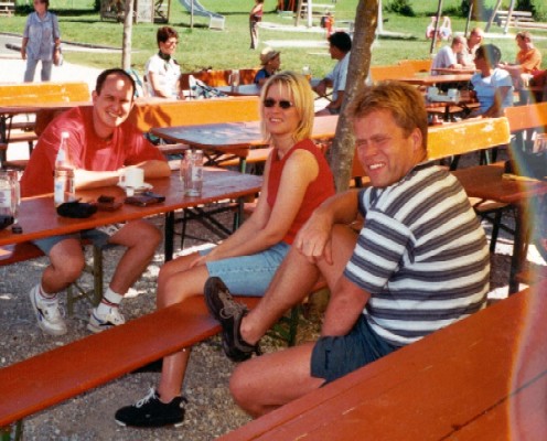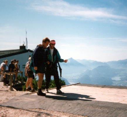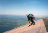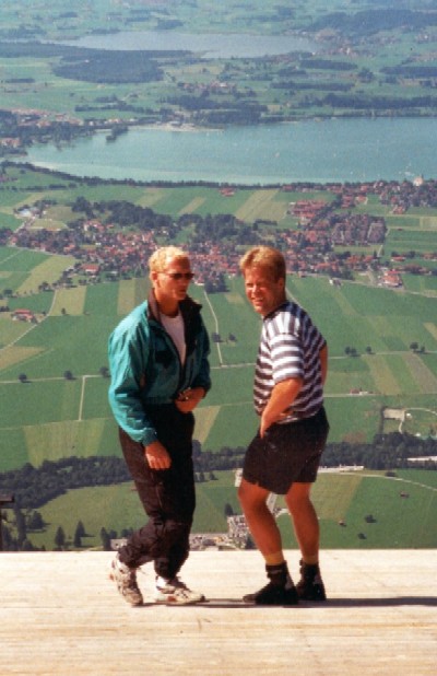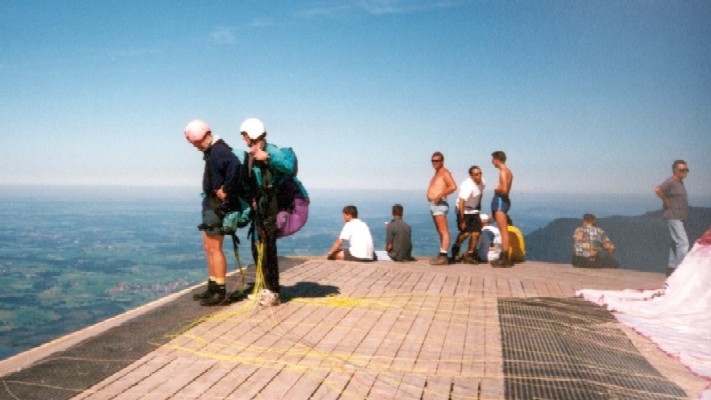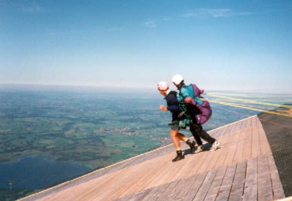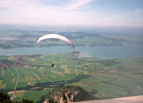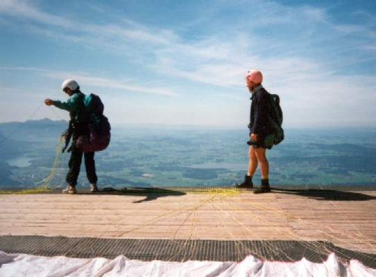 ... und dann ab zur Tegelbergbahn, die uns zur Abflugrampe bringt. Dort warteten auch schon unsere Tandempiloten von der 1. DAeC-Gleitschirm-Schule. Nach ein paar Erläuterungen und ein paar Startübungen an der Rampe wird es ernst. Aber dann geht alles ruckzuck, Leinen auslegen, angurten, anlaufen und Abflug ... geil. |