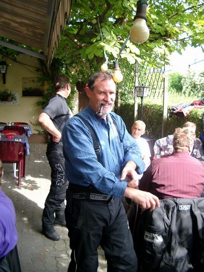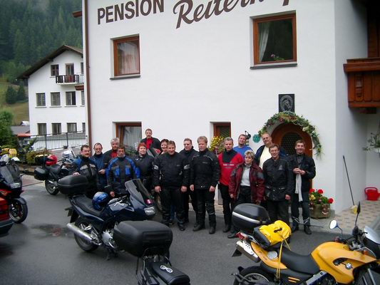1. Tag, Mittwoch, 06.00 Uhr. 21 Motorradfahrerinnen und -fahrer stehen startbereit auf dem Schulhof der ehemaligen Pfarrgasschule. Zwei fehlen noch, de 34 PS-Wolle und sei Freindin. Wir warten noch bis um 06.30 Uhr, und nachdem die beiden bis dahin immer noch nicht erschienen sind und auch telefonisch nicht zu erreichen waren, fahren wir los. Ab über Frankreich nach Straßburg, dort wieder über die Grenze nach Deutschland und die A5 runter bis Basel. Nach einer ausgiebigen Rast geht´s weiter über die schweizer Autobahn über Zürich bis nach Chur. Dort verlassen wir die Dosenbahn und fahren über die Lenzerheide, über den Albulapass und dann auf direktem Weg in Richtung Rechenpass nach Nauders. Gegen 17:30 Uhr kommen wir in Nauders im Reiterhof an und nehmen erst mal einen Begrüßungstrunk. Übrigens. De 34 PS hat sich gegen 11.00 Uhr telefonisch gemeldet. "Sie hätte vaschloof, hatter gesaat, un sie gängde jedzde losfahre" Kurz vor Einbruch der Dunkelheit kommen sie dann im Reiterhof an. |